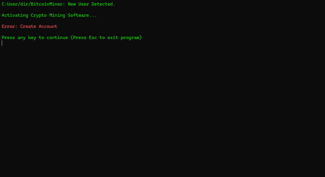 Single program game and the first program I have made. You create a temporary account that resets every game (Will Fix) that can't be taken. Then you wait until you get the 1 in 1000000 chance you get 1 bitcoin. I will add more features to make it more fun later. No, this is not a real crypto miner, it is just a program. Check the Code if you want there is nothing in there. Updates Coming Soon.
